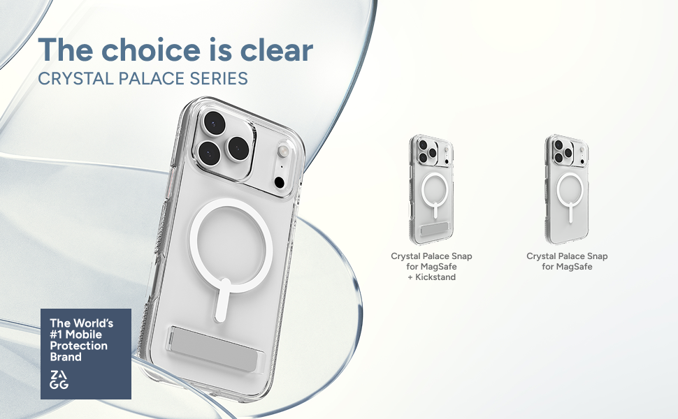 Crystal Palace™ Snap with Kickstand elegantly stands up to the task, balancing clarity with exceptional strength. This case covers every detail so you can focus on enjoying the phone you love. It starts with an incredible 13 feet of drop protection engineered into the case's structure, incorporating ultra-resilient graphene that reinforces without adding bulk. And we've added a kickstand and camera control button for ultimate usability. Crystal Palace™ Snap with Kickstand has anti-yellowing technology and anti-scratch finish to keep your case (and phone) looking pristine, and of course, it's built MagSafe compatible and works flawlessly with wireless chargers. It's the perfect sidekick — fitting in seamlessly while handling the heavy lifting.