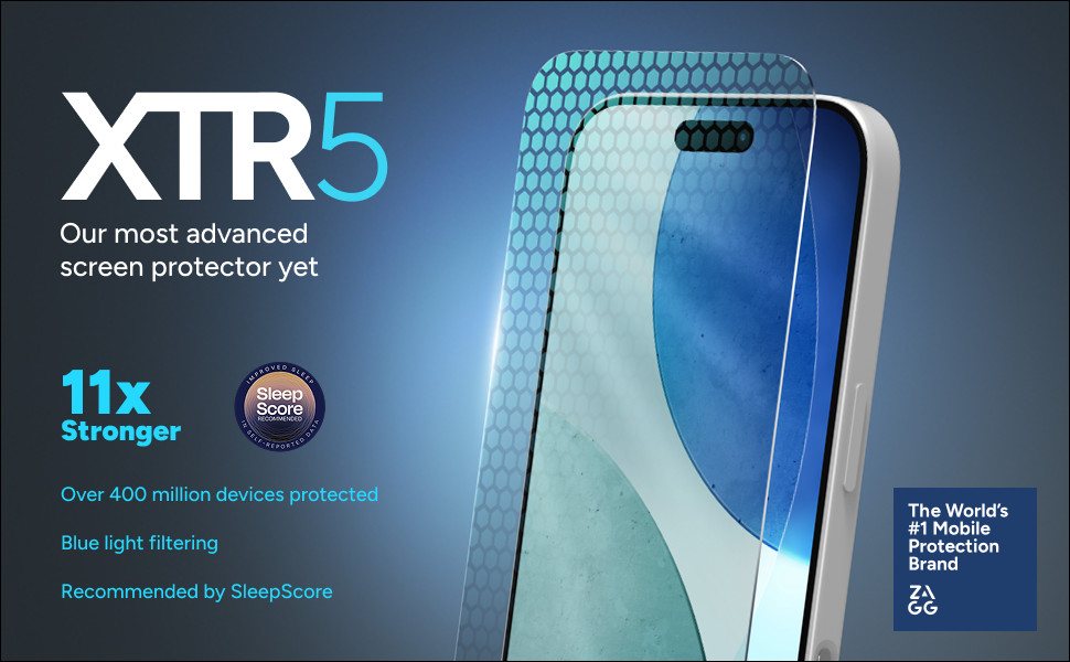 Introducing Glass XTR5, ZAGG’s strongest and most advanced screen protection, fortified with Graphene for unbeatable durability. It’s the only screen protector in the world with Eyesafe® CPF60 technology, which filters the most sleep-disrupting blue light - so you wake up refreshed. But XTR5 doesn’t stop there. With anti-reflective technology, it enhances color depth and vibrancy for a stunning display. Its ultra-smooth, hyper-responsive surface gives gamers the edge, while the anti-dust adhesive and PerfectFit™ Installation make setup effortless - just two steps, no bubbles. And because we care about our planet, XTR5 is made with up to 30% recycled glass and comes in 100% recyclable packaging. Stronger. Smarter. Better.