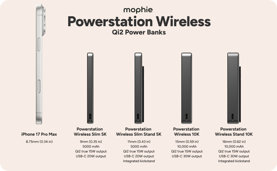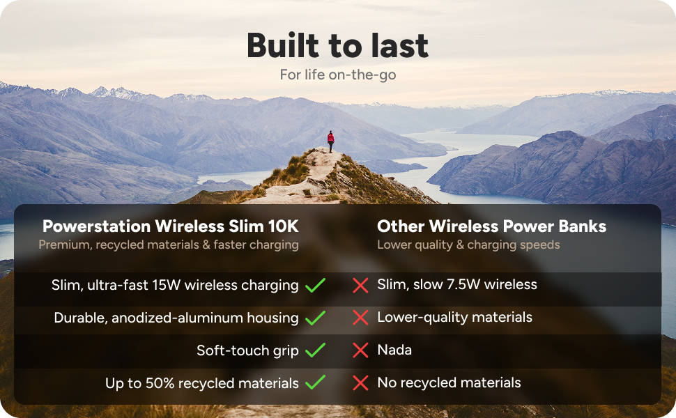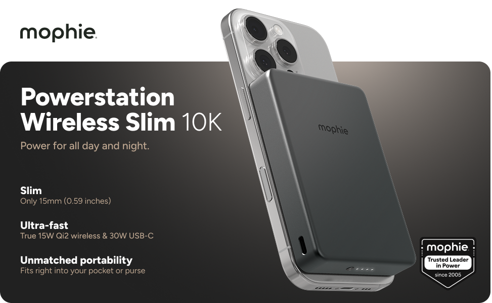 Stay powered up with the slim and powerful Powerstation Wireless Slim. With a 10,000mAh internal battery, Qi2-certified wireless charging, and fast USB-C PD output, this compact power bank delivers up to two full phone charges. Designed with premium sustainable materials and airline-approved, it’s the perfect travel companion backed by a 2-year warranty.