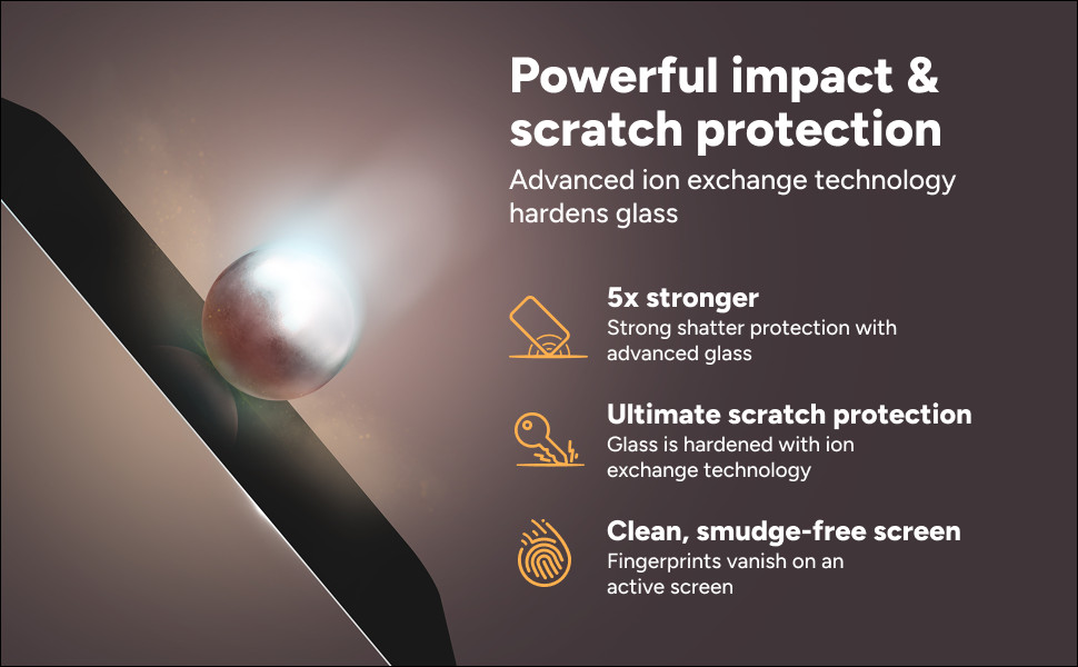 • Aluminosilicate glass is strengthened with ion exchange technology for greater strength and scratch-resistance.