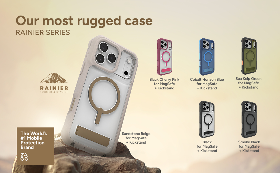The rugged Rainier case is ZAGG's most extreme impact protection. Fortified with Graphene, this 2-piece case snaps together easily to provide up to 22 feet of drop protection. Reinforced bumpers in the corners of the case provide extra defense where you need it most. The kickstand on the Rainier case holds your phone securely in portrait or landscape mode, and it folds back flush with the case when not in use. Just because it's rugged doesn't mean Rainier skimps on style. Its sleek, compact design looks sharp in any situation. The magnetic Rainier is compatible with magnetic wireless chargers and accessories. It's even got lanyard attach points, so you can go hands-free while keeping your phone constantly close at-hand.