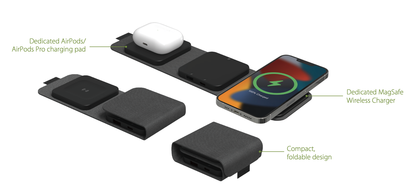 The snap+ multi-device travel charger has everything you need to charge on-the-go. Designated wireless charging spots for your phone and AirPods provide a shared output of up to 5W-15W of power. It also has a USB-C port and a USB-A port, so you can plug in two additional devices to charge. The travel charger folds neatly into a bundle that fits easily in your bag.